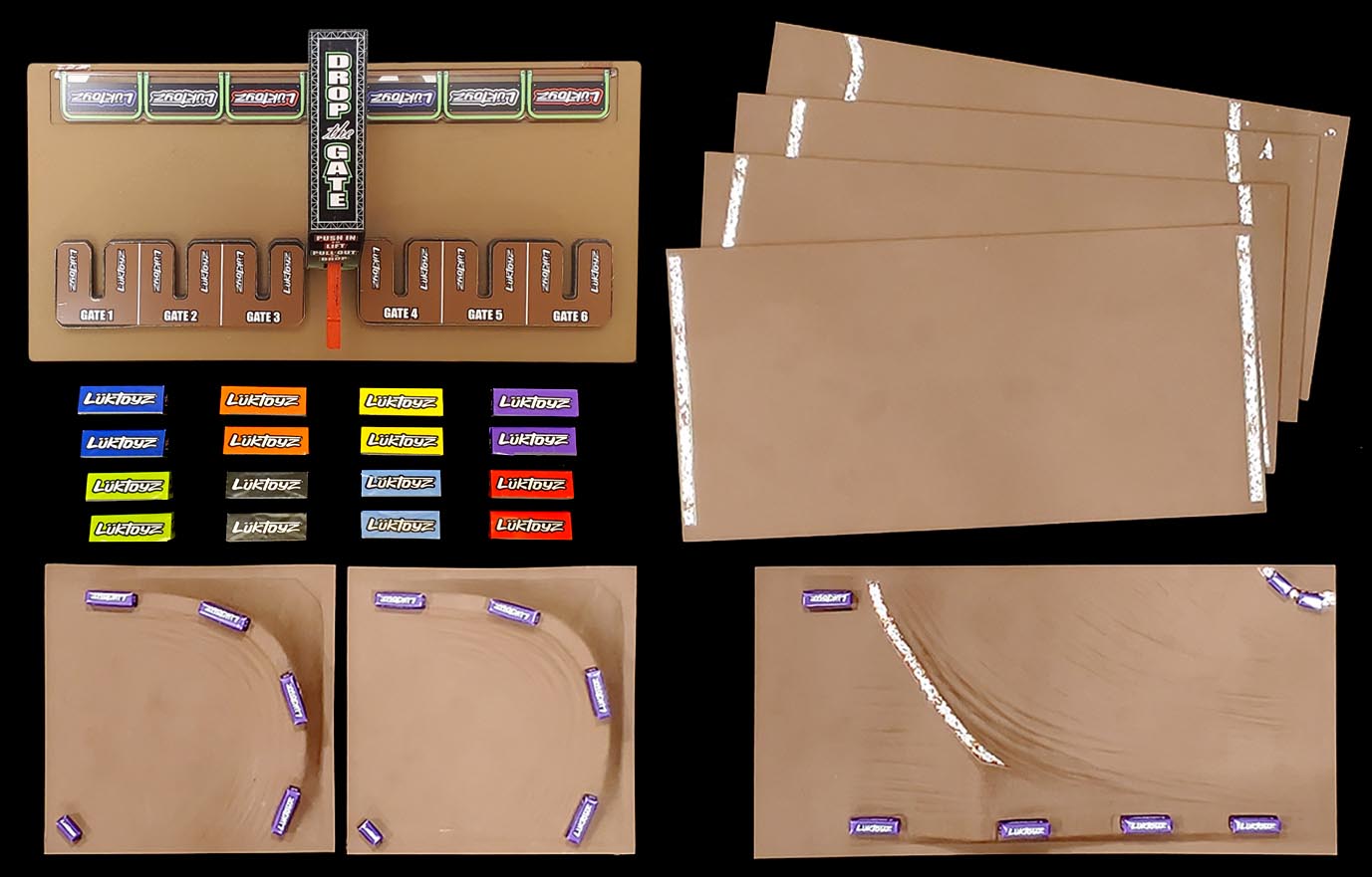 1qty Start Gate with 2qty 3-Position Staging Blocks, 1qty Funnel Transition piece, 2qty Funnel Switchback Berms, 16qty Mechanic Blocks, and 4qty Flatties with chalk decals.