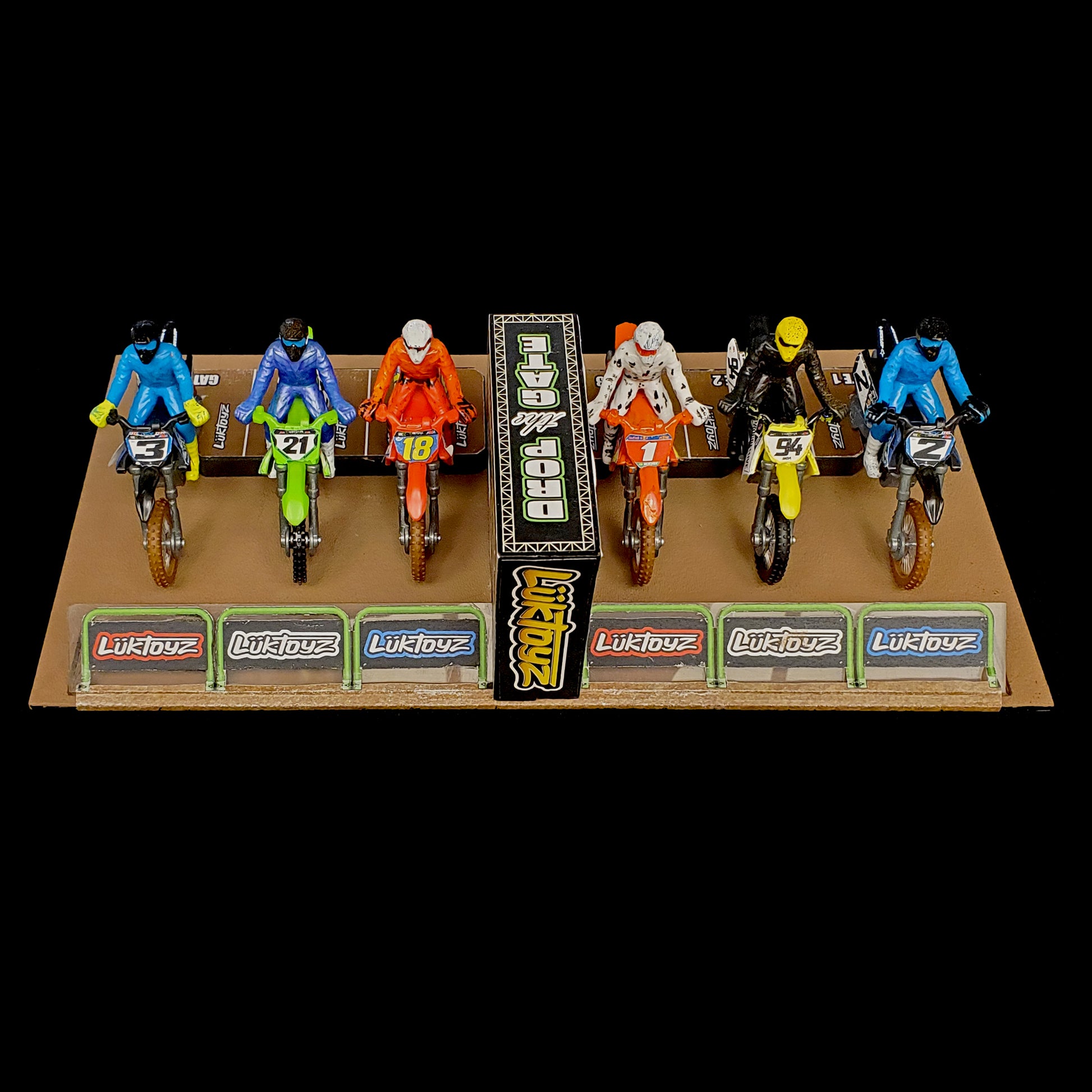 Fully actuated (raise and drop with push/pull slider) start gate with 6 stations and includes 2qty TEAM style rider staging blocks. Designed for Spin Master 1:24 SX toys. (Toys not included.)